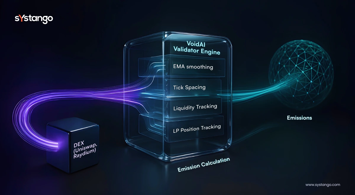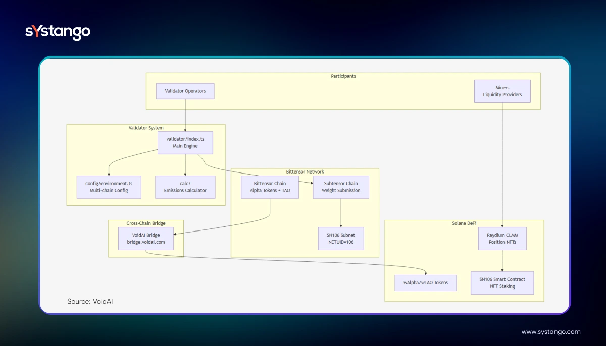 Unlike most Bittensor validators (Python-based), VoidAI’s validator logic was built in TypeScript, enhancing integration with Systango’s infrastructure stack and improving cross-chain data handling. This enhanced cross-chain integration and allowed faster, more reliable reward distribution for LPs. -