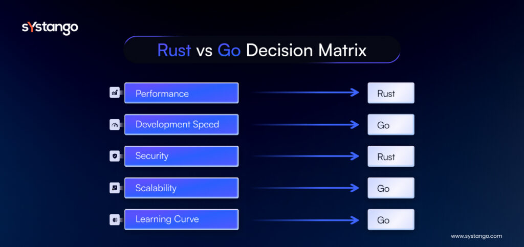 - If your priority is maximum performance, memory safety, and long-term system reliability, Rust provides a future-proof engineering foundation.