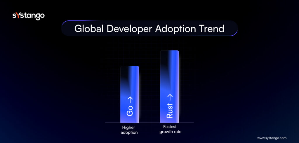 The Rust vs Go job market 2026 shows Go developers still more widely available, which impacts hiring speed and project timelines.
